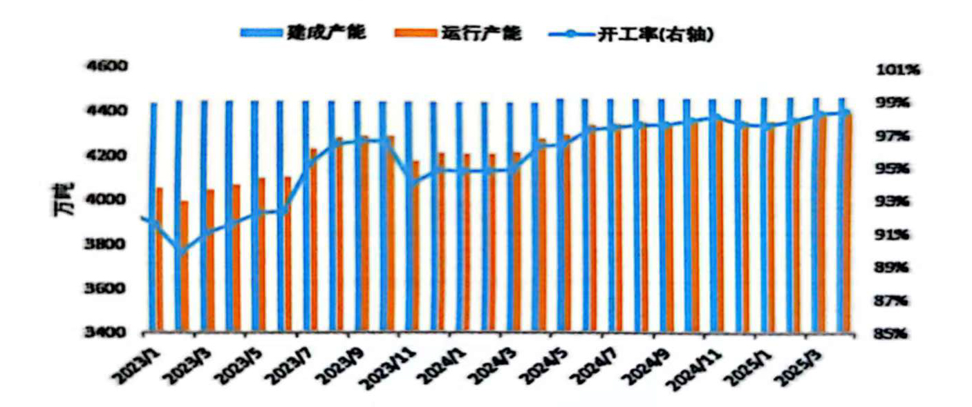 2025年4月,國內(nèi)電解鋁生產(chǎn)能力小幅提升,截至4月底建成產(chǎn)能4467萬噸/年,運行產(chǎn)能4393萬噸/年,環(huán)比增加4萬噸/年。本月運行產(chǎn)能增量主要來自四川、青海等停產(chǎn)產(chǎn)能的恢復(fù)和新增項目的釋放。在總產(chǎn)能接近“天花板”和開工率已達到98%以上的背景下,產(chǎn)能和產(chǎn)量的增長空間都已十分有限。4月份產(chǎn)量預(yù)計為362萬噸,同比增長3.4%,日均產(chǎn)量12.07萬噸,環(huán)比小幅增長0.2%。