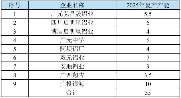 表1-2 2025年中國電解鋁復(fù)產(chǎn)產(chǎn)能變動情況(萬噸/年)