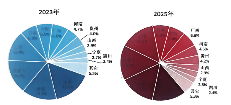 圖1-3 2023年和2025年中國電解鋁產(chǎn)能分布