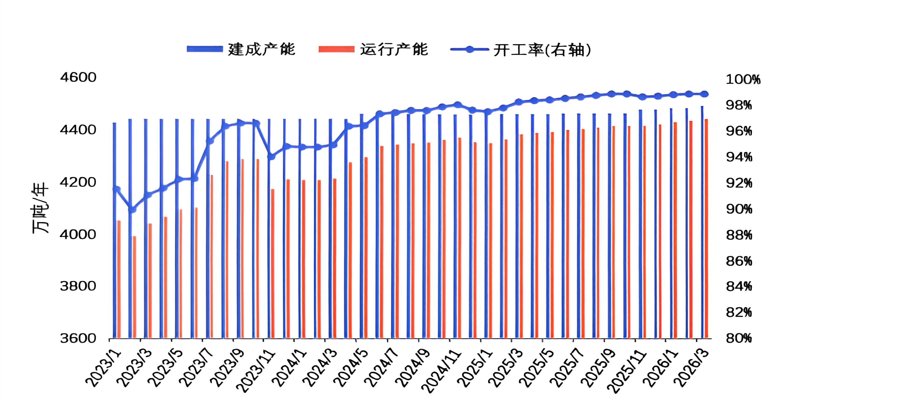 2026年3月,國內(nèi)電解鋁產(chǎn)能維持高位運行。截止到3月底,建成產(chǎn)能4498萬噸/年,運行產(chǎn)能4447萬噸/年,環(huán)比增加8萬噸/年,整體產(chǎn)能規(guī)模保持穩(wěn)定,運行產(chǎn)能小幅提升。
