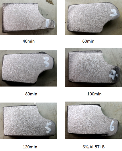 本次對(duì)比性試驗(yàn)及試用,歷時(shí)兩天,共進(jìn)行了三次反復(fù)試驗(yàn),由渤海活塞張總主導(dǎo)安排實(shí)驗(yàn),技術(shù)部孟主任、徐工、范工參與執(zhí)行。細(xì)化標(biāo)的鋁合金AlSi12,配制每爐200kg鋁液,三次試驗(yàn)的AlTi5C0.2添加量分別為2‰、2‰、6‰,添加位置分別為精煉除氣前、精煉除氣后并再攪拌2分鐘、精煉除氣前,實(shí)際細(xì)化時(shí)長(zhǎng)均超過(guò)120分鐘,期間每20分鐘取一次樣,每次試驗(yàn)共取6個(gè)樣塊。
