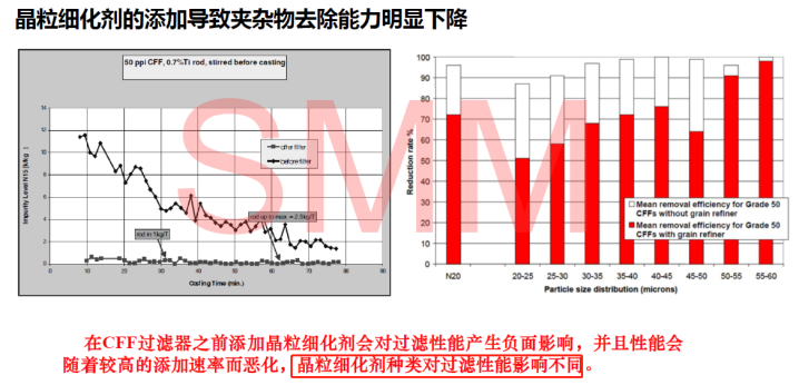 據(jù)丁總調(diào)查顯示,常用細(xì)化劑會(huì)對(duì)CFF過濾器的過濾性能產(chǎn)生負(fù)面影響,并隨較高的添加速率而惡化,并顯示晶粒細(xì)化劑種類對(duì)過濾性能影響不同。據(jù)業(yè)內(nèi)相關(guān)試驗(yàn)調(diào)查,鋁鈦碳或因無TiB2,從而減少對(duì)CFF過濾器的吸附、堵塞,會(huì)大大降低細(xì)化劑對(duì)過濾器性能的影響。