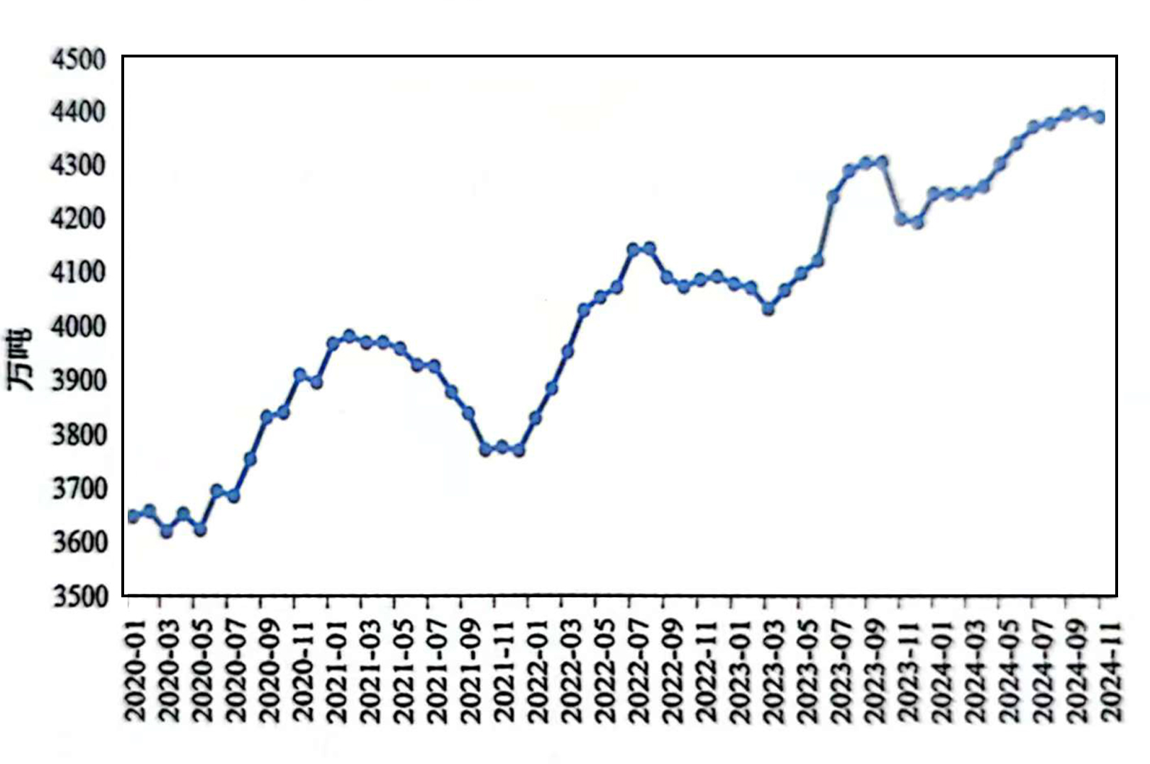 2024年11月,中國(guó)電解鋁企業(yè)增減產(chǎn)并存。減產(chǎn)方面,河南、廣西、貴州、四川等地區(qū)的部分鋁廠由于環(huán)保、生產(chǎn)經(jīng)營(yíng)壓力大等因素而宣布檢修、停槽或放緩復(fù)產(chǎn)計(jì)劃:新投方面,11月初貴州地區(qū)雙元鋁業(yè)二期項(xiàng)目鋁水下線,預(yù)計(jì)12月底全部投產(chǎn),新疆信發(fā)、寧夏寧創(chuàng)也在持續(xù)投產(chǎn)中。11月國(guó)內(nèi)電解鋁建成產(chǎn)能4462萬(wàn)噸/年,運(yùn)行產(chǎn)能4374萬(wàn)噸/年,較上月增長(zhǎng)11萬(wàn)噸/年。11月份產(chǎn)量為360.6萬(wàn)噸,環(huán)比下降3.4%,同比增長(zhǎng)4.5%,日均產(chǎn)量12.02萬(wàn)噸,環(huán)比小幅下降0.2%。