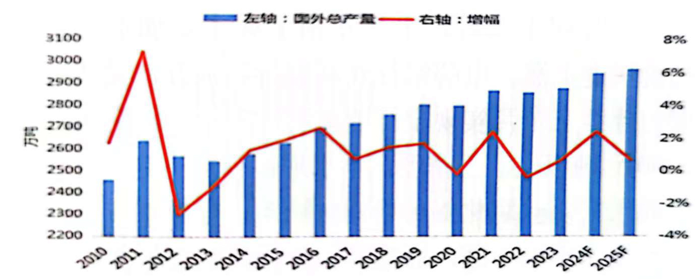 圖2-2 2010-2025F國外電解鋁產(chǎn)量
