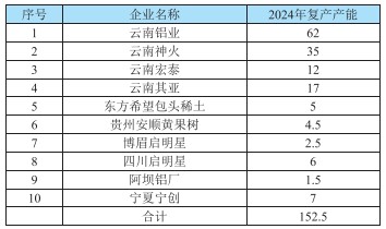 表2-2 2024年中國電解鋁復(fù)產(chǎn)產(chǎn)能變動情況(萬噸/年)