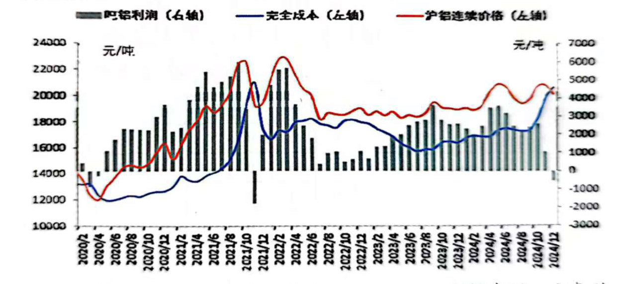 2024年,盡管氧化鋁價格大幅波動導致電解鋁成本重心明顯抬升,但從全年來看,鋁價持續(xù)高位運行,電解鋁行業(yè)依舊維持2000元/噸以上的利潤,尤其是在5月份,利潤達到3581元/噸的年內(nèi)最高水平。根據(jù)安泰科測算,2024年中國電解鋁加權(quán)平均完全成本(含稅)為17717元/噸,同比增加7.4%或1223元/噸;全年噸鋁平均利潤約為2227元,同比增加0.9%或20元。